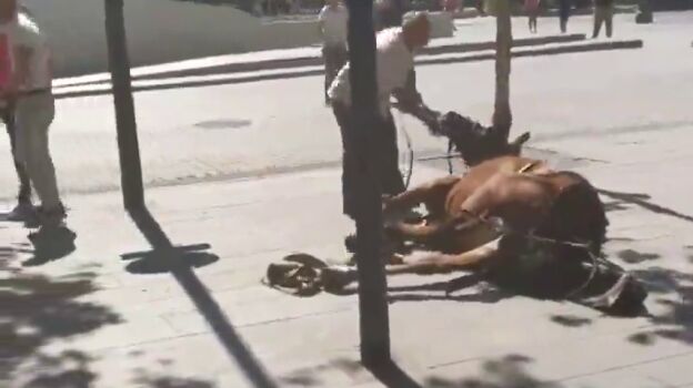 La caída de un caballo que transportaba un coche turísticoen Sevilla ha provocado una monumental bronca entre los viandantes y los propietarios del animal. PACMA ha compartido unas imágenes en las que se puede ver al equino en el suelo incapaz de incorporarse.