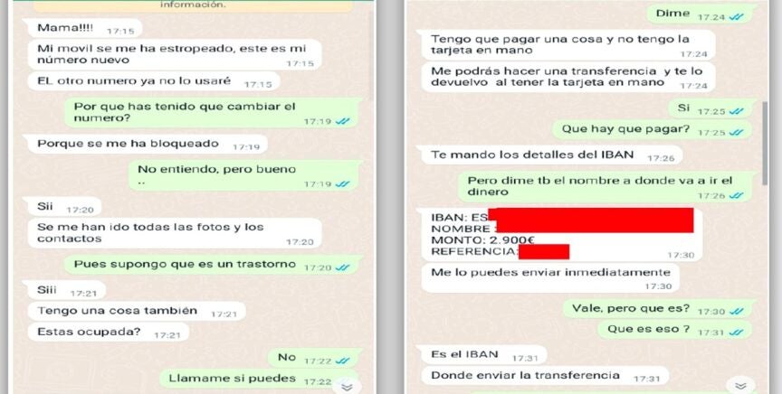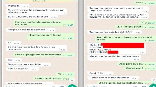 Lo primero que hacen es contar que se han cambiado de número de teléfono porque se les ha estropeado el teléfono, tal y como se puede leer en las capturas de pantalla que ha compartido la Policía Nacional en sus redes sociales. Acto seguido, piden a la víctima que le hagan una transferencia de 2.900 euros asegurando que se le van a devolver. "Tengo que pagar una cosa y no tengo la tarjeta en mano", señalan.