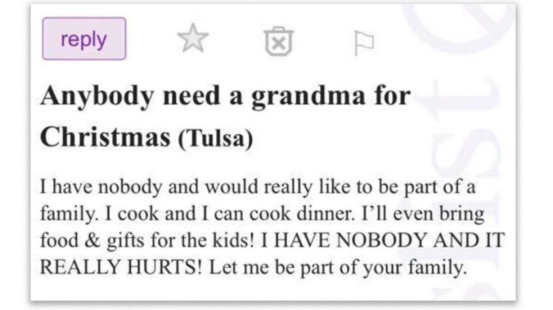 Carrie, una mujer de Oklahoma, Estados Unidos, ha publicado una oferta en la página web Craiglist en la que se ofrecía a cocinar la cena de Navidad si alguien la acogía durante las fiestas: "¿Alguien necesita una abuela por Navidad?"