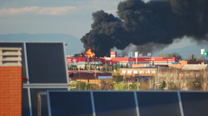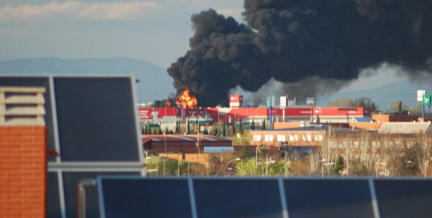 Aparatoso incendio en una nave de reciclaje de plástico y papel en Alcorcón, Madrid