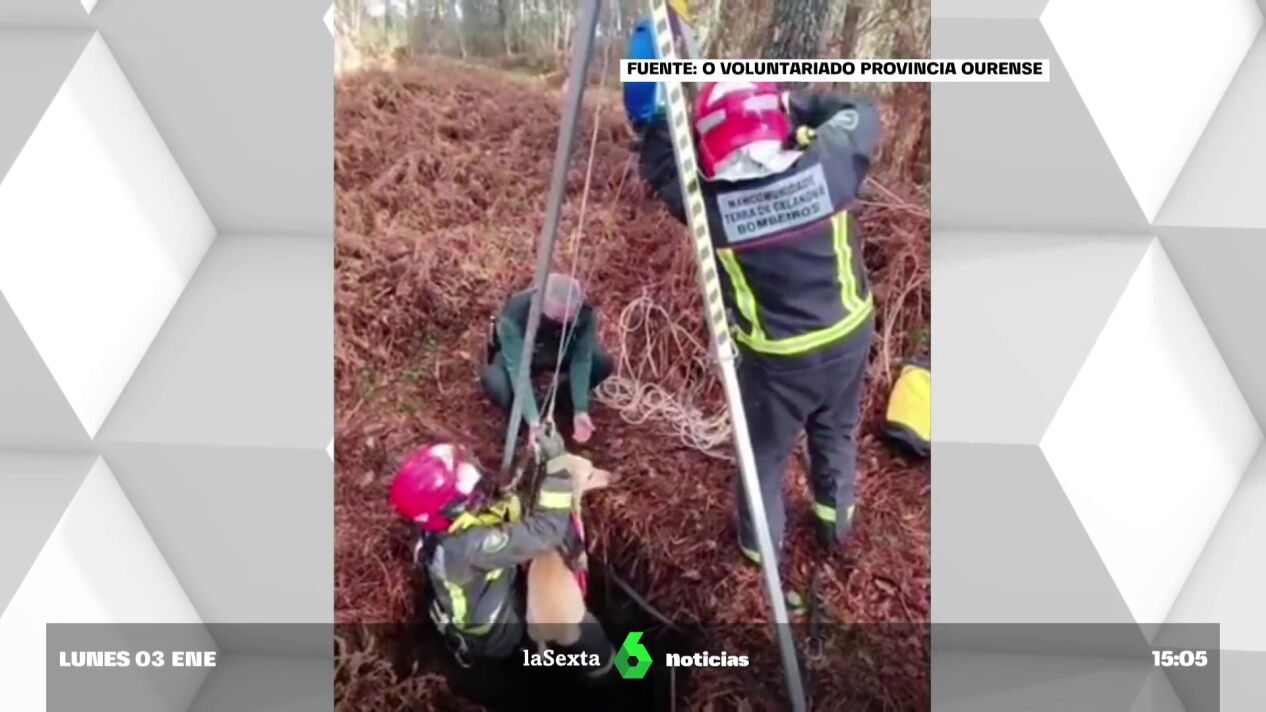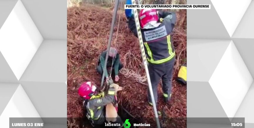 Un aparatoso rescate... y un final feliz. Los bomberos, la Guardia Civil y voluntarios de Protección Civil han participado en el salvamento de dos perros en Ourense, que se habían quedado atrapados en un pozo de 6 metros de profundidad.