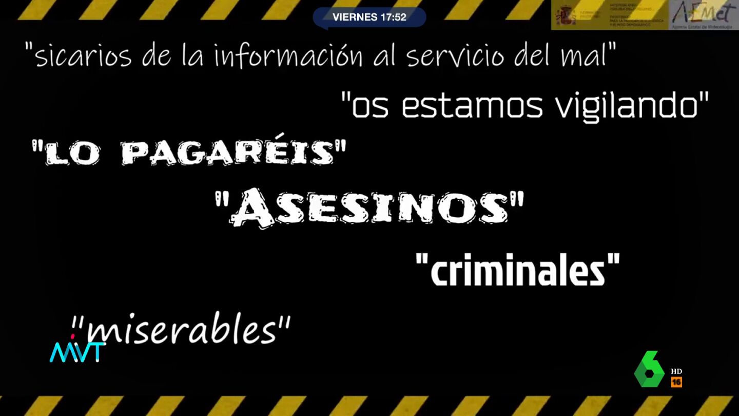 "Asesinos", "Criminales", "Miserables" o "Sicarios de la información al servicio del mal" son solo algunos de los insultos que reciben. Sin embargo, la cosa no queda ahí. Y es que también reciben amenazas. "Os estamos vigilando" o "Lo pagaréis" son algunas de ellas. "Estos son los insultos y amenazas que reciben los empleados públicos y los comunicadores de la meteorología en el ejercicio de su trabajo", señalan desde la AEMET en el vídeo que han difundido.