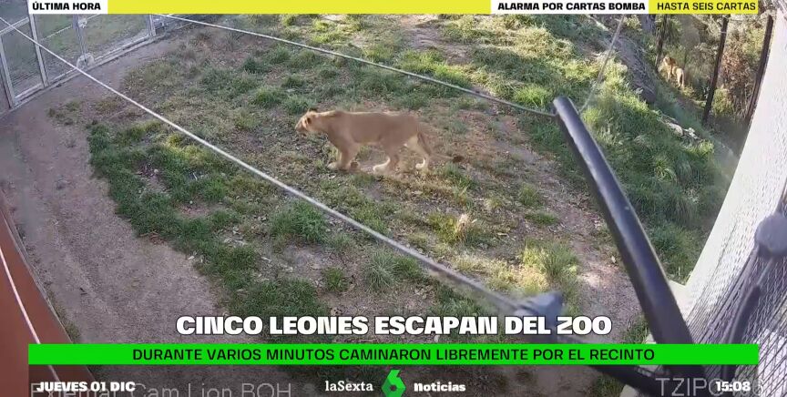 El vídeo muestra a lo lejos a los leones jugando con la valla metálica que los mantiene enclaustrados en un hábitat al aire libre, poco antes de que una de las crías lograra burlar el sistema de seguridad y saliera por debajo de la cerca a través de un agujero.
