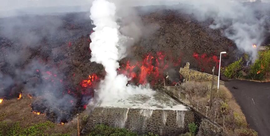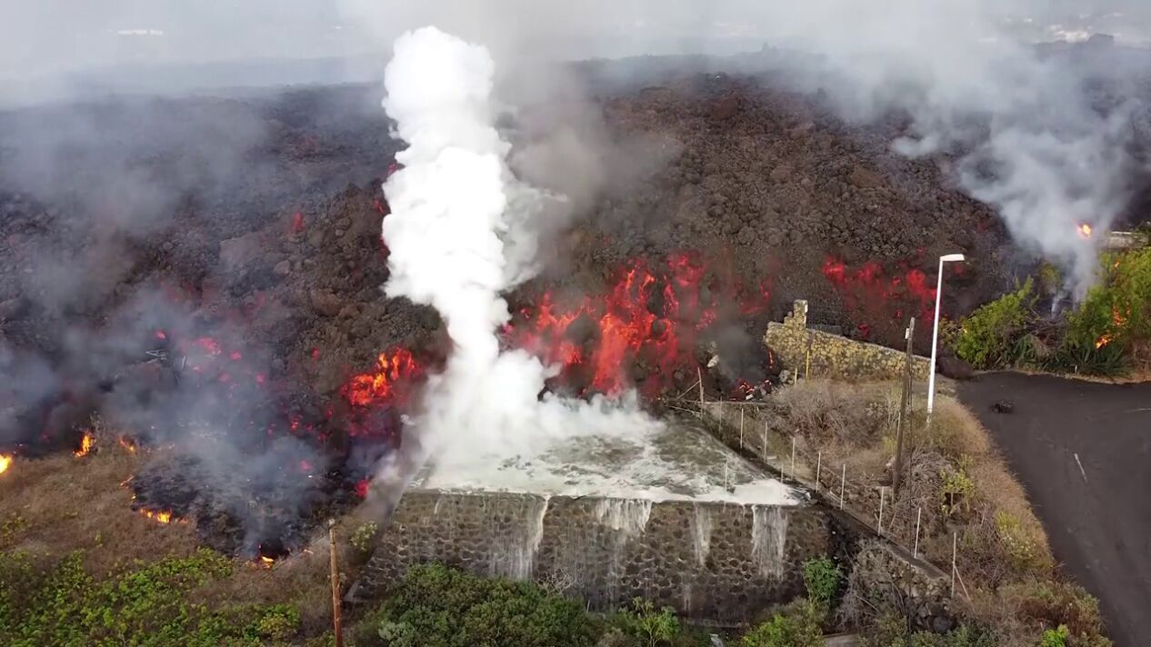 Un dron ha podido captar el impactante momento en el que la lava del volcán de La Palma entra en contacto con una piscina. A menor escala, ilustra lo que podría ocurrir cuando llegue al mar.