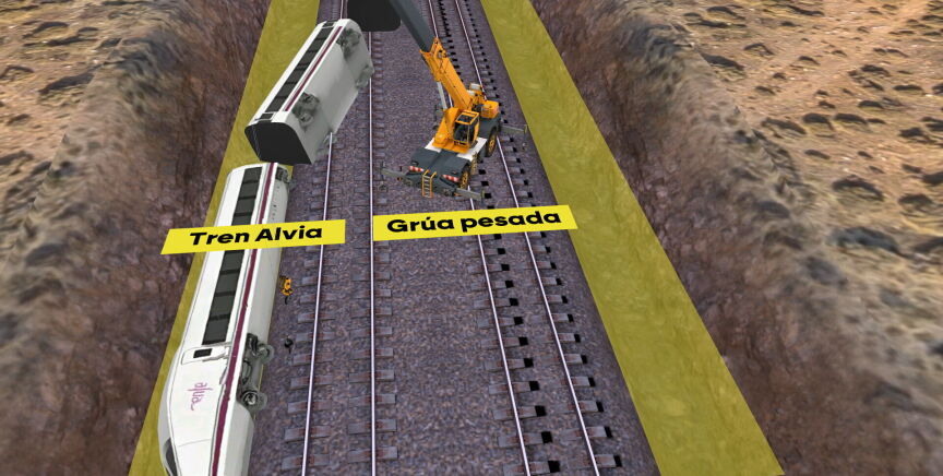 Al fondo, se puede ver el tren Alvia, el objetivo final de la operación. Llegar hasta él no es fácil. Primero, hay que retirar los vagones descarrilados del Iryo y allanar el terreno, para que las grúas de gran tonelaje puedan recorrer los 800 metros que separan la zona de trabajo del tren siniestrado.