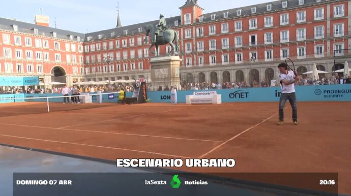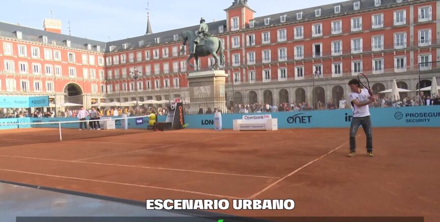 Habitualmente pasean miles de personas al día por la Plaza Mayor de Madrid, pero ahora también podrán jugar al tenis una nueva pista, que replica todos los detalles de la original del Mutua Madrid Open. Se trata de una exhibición poco convencional que pretende no pasar inadvertida y acercarse al público.