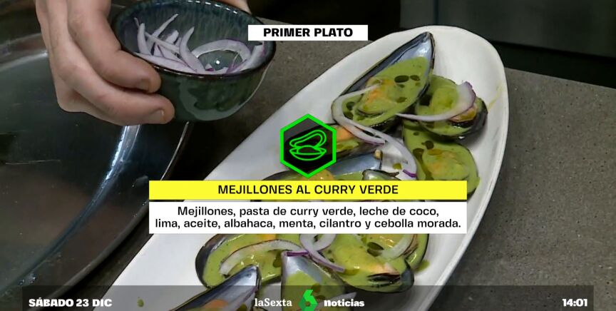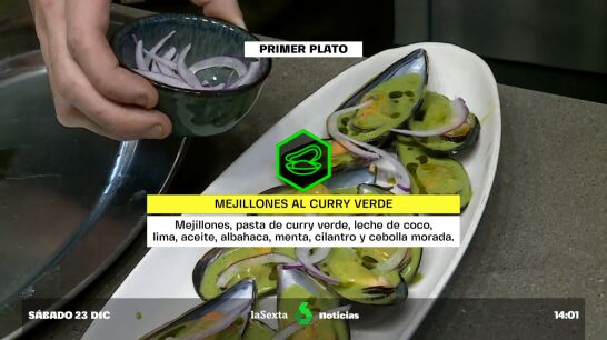 Como primer plato, tenemos unos mejillones con salsa de curry verde. Para ello, necesitaremos hacer la salsa con pasta de curry verde y leche de coco. Por último, aderezar el plato con lima, un aceite con hierbas aromáticas y cebolla morada cortada en juliana.