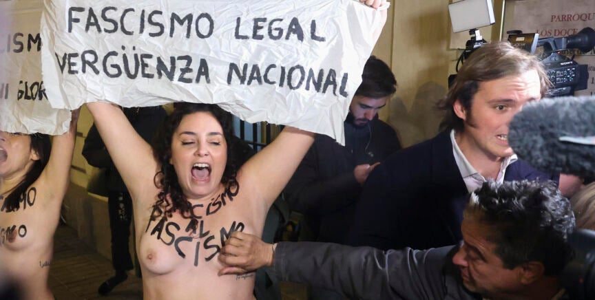 Las dos mujeres protestaban con el pecho descubierto por la misa convocada en honor al dictador en la parroquia de los Doce Apóstoles de Madrid, en cuya entrada se ha instalado una pequeña mesa para la venta de objetos relativos a Francisco Franco, con una bandera preconstitucional.