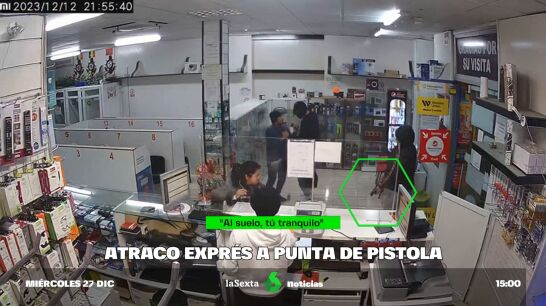 Uno de los atracadores se encarga de vaciar los 4.780 euros en efectivo de la caja registradora mientras, otro de ellos, se hace en segundos con todos los teléfonos móviles de esta vitrina. Un total de 20 valorados en 5.000 euros. Aún así, el ladrón que da las órdenes, insiste mientras apunta con la pistola: "¿Dónde hay más dinero? ¡Quiero más dinero!". El tercer atracador vigila que ninguna de las víctimas llame a la policía.