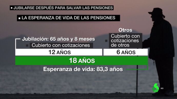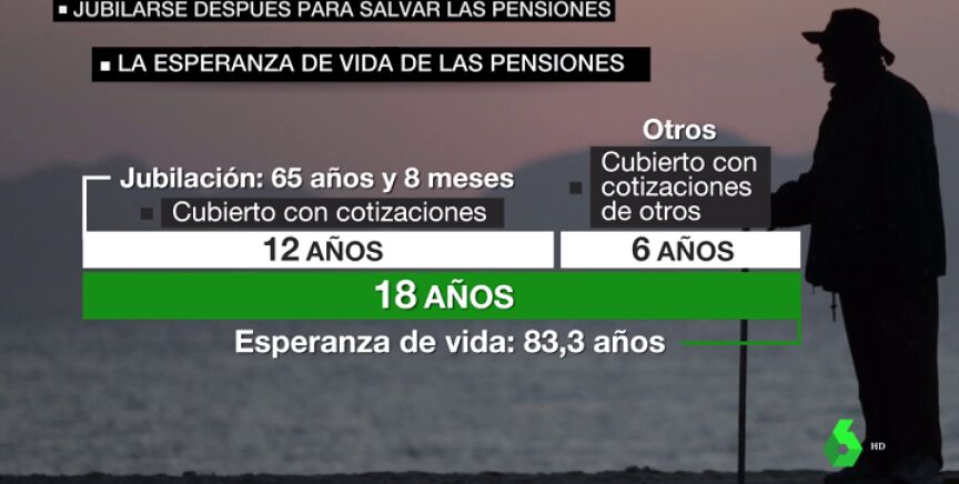 Si ahora nos jubilamos con 65 años y 8 meses y la esperanza de vida de España se alarga hasta los 83,3 años disfrutamos de una pensión 18 años: 12 años cubiertos por nuestras cotizaciones y seis solidariamente por el resto.