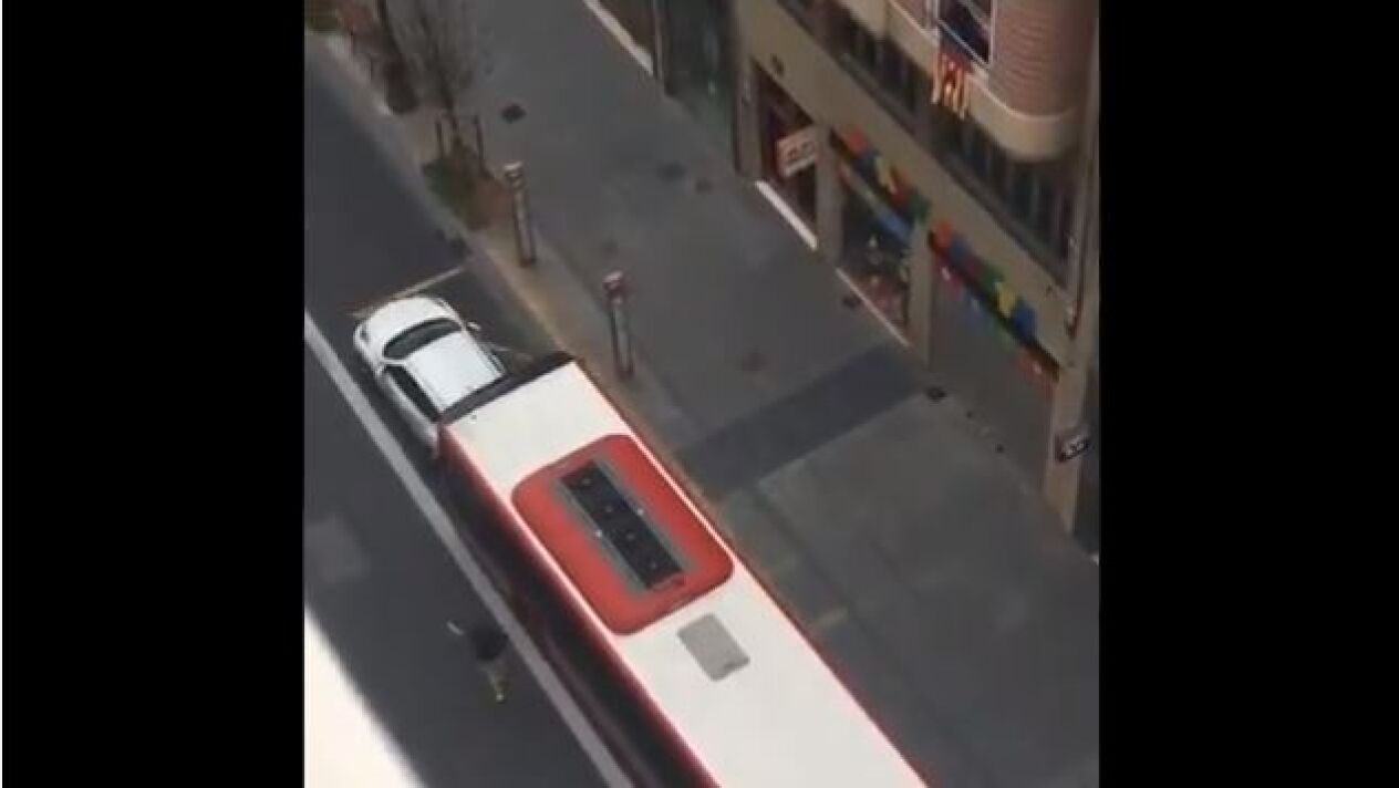 En ese momento, el autobús se pone en marcha y golpea al turismo, que tenía la puerta abierta, desplazándolo varios metros hacia adelante. Ante la mirada del dueño del turismo, que grita y levanta los brazos en señal de incredulidad, el autobús arrolla por segunda vez el vehículo, sacándolo así del carril bus.