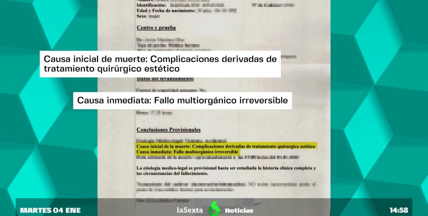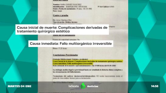 Las conclusiones provisionales de la autopsia de Sara, la mujer de 39 años fallecida tras una lipoescultura a la que se sometió en Cartagena, apuntan que la causa inicial de la muerte fueron las "complicaciones derivadas de tratamiento quirúrgico estético" y que la causa inmediata de su defunción fue un "fallo multiorgánico irreversible".