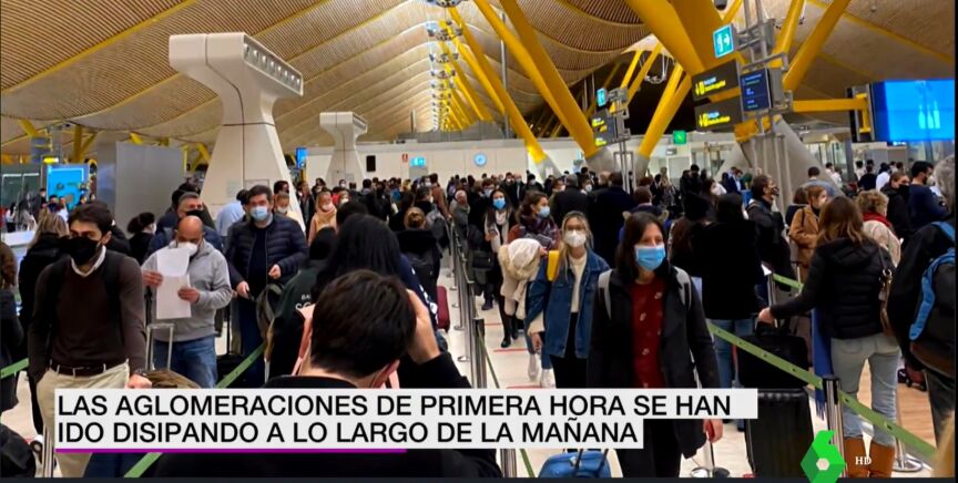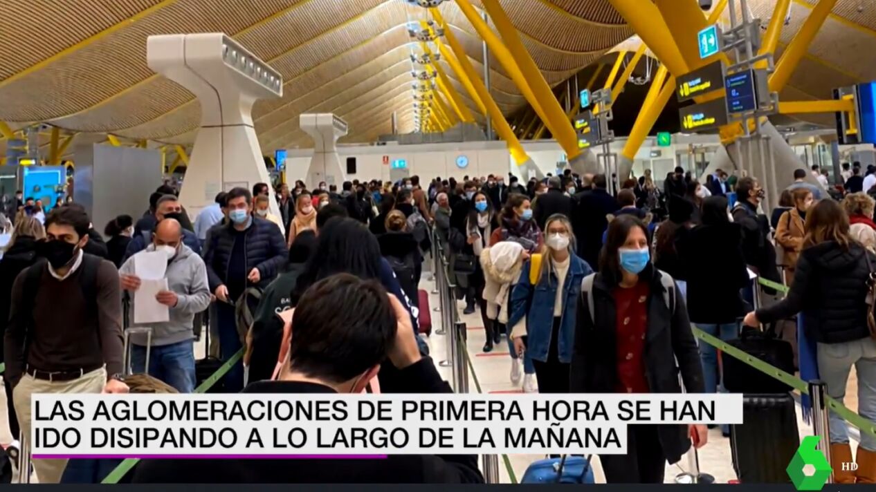 A primera hora de la mañana, la zona de control de la T4 del aeropuerto de Barajas, en Madrid, no mostraba una imagen muy diferente a la de cualquier otra Navidad sin pandemia. Aunque estas aglomeraciones se han ido disipando a lo largo de la mañana.