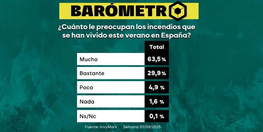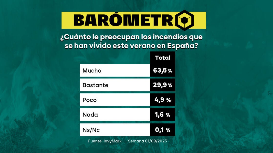 La herida por los incendios que asolaron España este agosto sigue muy abierta. Eso es lo que dice el barómetro de laSexta, gracias a datos del instituto Invymark. Según los resultados, a un 63,5% de los encuestados les preocupa mucho la situación con el fuego y a casi un 30% bastante.