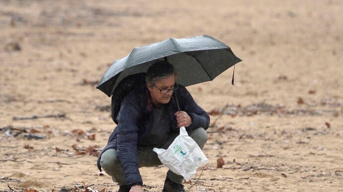 La lluvia y el viento complican la labor de los voluntarios y los medios de la Xunta en la recogida de pellets en las playas gallegas, porque estas pequeñísimas bolas blancas de plástico acaban enterradas y camufladas en la arena, con lo que resulta muy difícil distinguirlas.