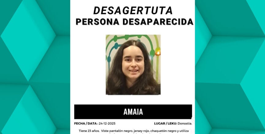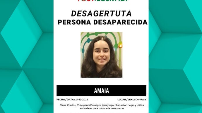 Una joven de 23 años, llamada Amaia, está desaparecida desde el pasado 24 de diciembre en San Sebastián, según informó el Departamento vasco de Seguridad. La última vez que fue vista vestía un pantalón negro, jersey rojo, chaquetón negro y auriculares verdes. A pesar de los esfuerzos de búsqueda, aún no ha sido localizada. Vost Euskadi, en colaboración con 112 SOS Deiak, ha solicitado la ayuda ciudadana para encontrarla. Se insta a quienes tengan información relevante sobre su paradero a contactar con el número de emergencias 112 para colaborar en su búsqueda.