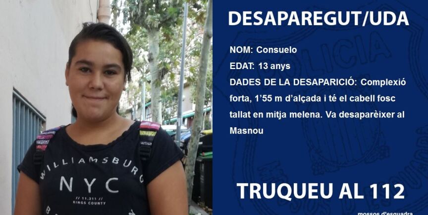 "Consuelo desapareció en El Masnou. Ayúdanos a encontrarla", han pedido los Mossos en su cuenta de Twitter, acompañando la publicación de una imagen de la menor, una descripción de Consuelo y las palabras 'llama al 112" en catalán y en mayúsculas.