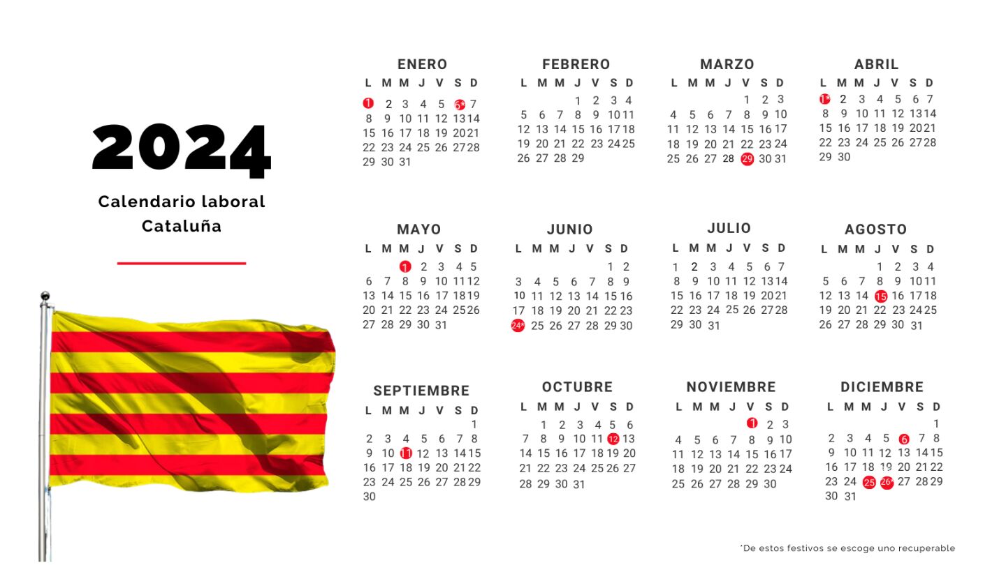 Los festivos de Cataluña de 2024 dibujan la siguiente distribución: tres lunes festivos, tres miércoles, dos jueves, tres viernes y dos sábados. Cabe tener en cuenta que dentro de estas fechas hay un festivo adicional de carácter recuperable y faltaría añadir los dos locales.