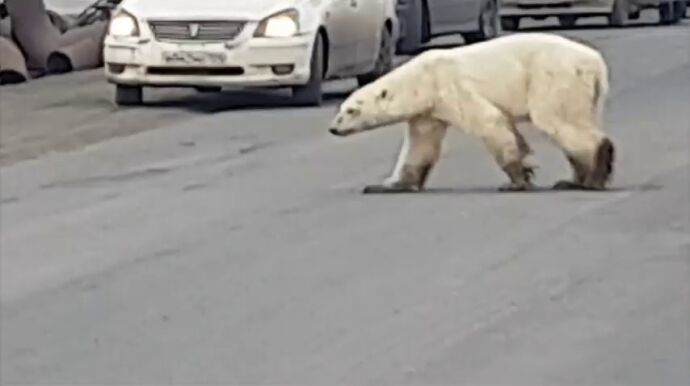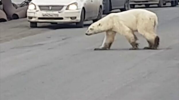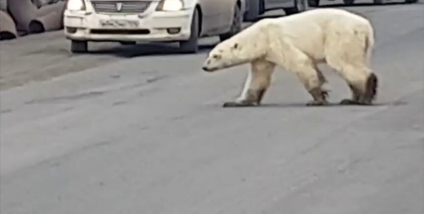Captan a un oso polar hambriento vagando por las calles de una ciudad rusa en busca de comida