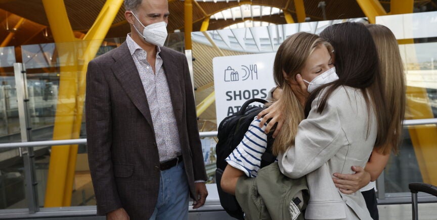 Felipe VI y la reina Letizia han acompañado a su hija al aeropuerto de Barajas, donde también se ha despedido de su hermana, Sofía, a la que se ha visto algo afectada en las fotografías distribuidas por la Casa Real. Con sus padres, Leonor se ha abrazado con una sonrisa. En la despedida con su hermana, a Sofía se la ha visto algo más triste. La princesa de Asturias, que cargaba una maleta y mochila, ha entrado sola a la zona de embarque mientas los reyes y la infanta saludaban.