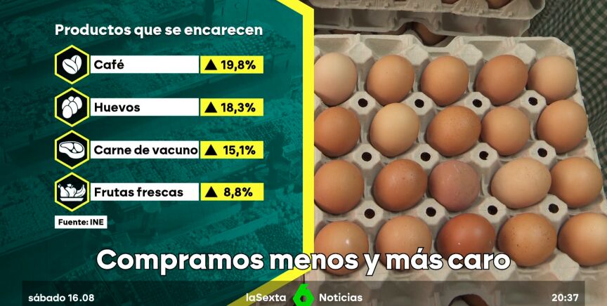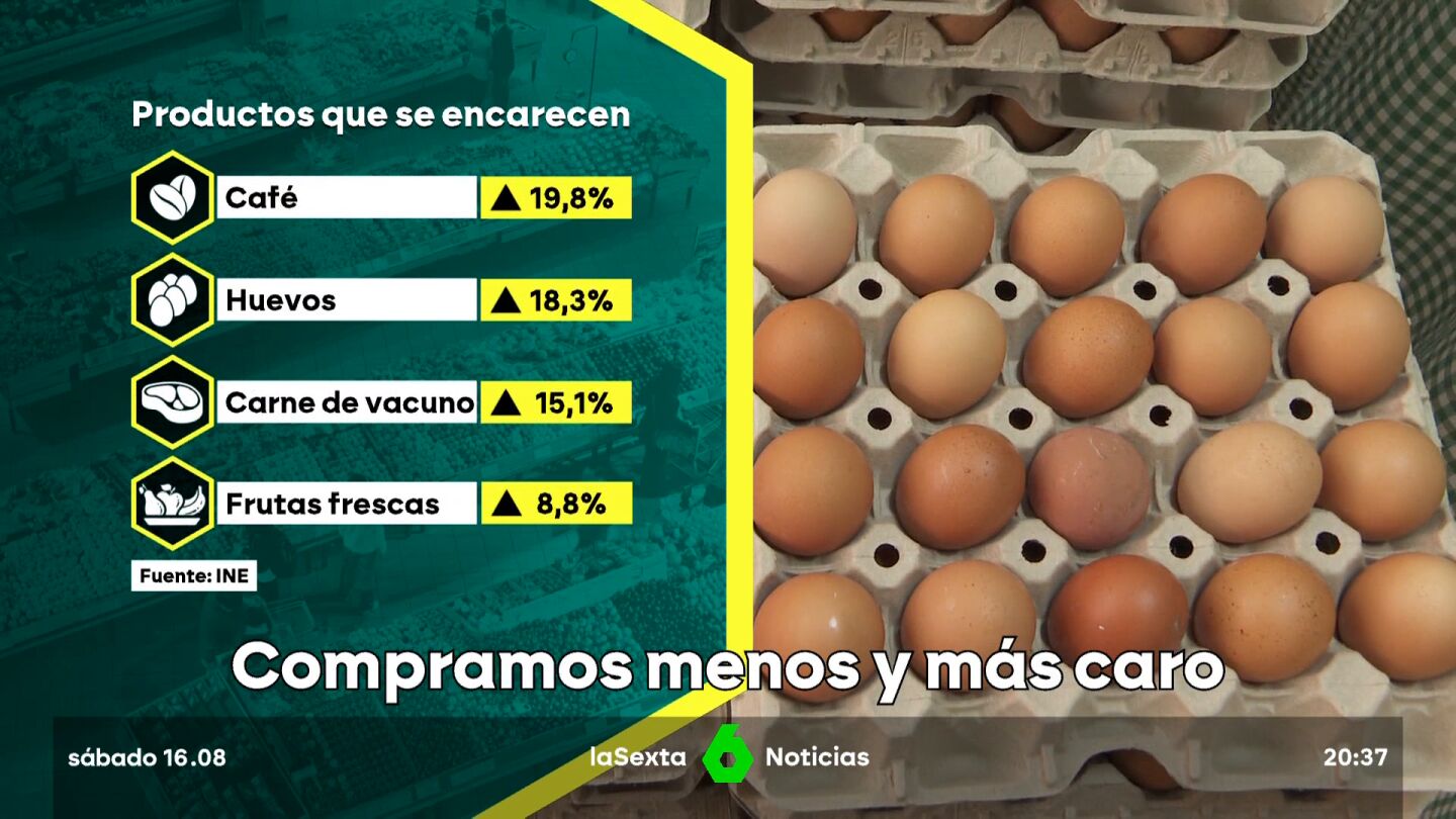 Algunos ciudadanos confiesan haber eliminado directamente algunos alimentos de la lista de la compra: "Hemos reducido el consumo de pescado sobre todo". Otros sostienen que son dos y gastan "500 euros cada mes en comer". El café está subiendo nada más y nada menos que un 19,8%, mientras que los huevos un 18,3 y la carne de vacuno un 15,1%.