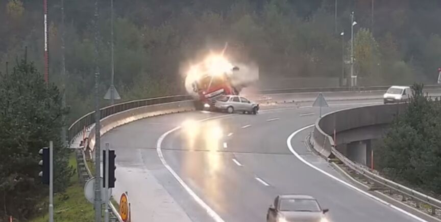 Consecuencia de la colisión, la cisterna del camión impactó contra la valla de seguridad atravesándola por completo. Su fuerza era tal que la propia cisterna se acabó precipitando al vacío, desde una altura de 20 metros, arrastrando con ella todo el camión. Y al camionero, que murió, según ha informado Slovenia News.