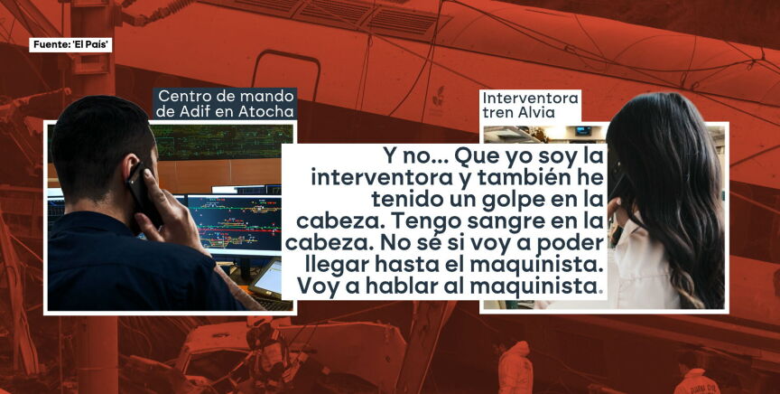 "Tengo sangre en la cabeza, voy a intentar hablar con el maquinista". Así se dirigía una interventora del Alvia accidentado en Adamuz a un responsable del puesto de mando, en la estación de Atocha. El controlador recurrió a ella ante la imposibilidad de contactar con el maquinista, que ya había muerto a consecuencia del impacto con el Iryo que había descarrilado previamente. Según publica 'El País', desde el centro de control llamaron hasta en dos ocasiones al maquinista.