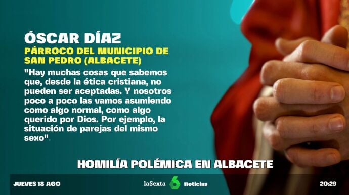 El cura de San Pedro (Albacete), Óscar Robledo, ha utilizado el púlpito de su iglesia para asegurar que la sociedad está siendo "adoctrinada" y que los homosexuales no son algo "normal" ni "querido por Dios".