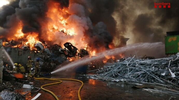 Los Bomberos de la Generalitat trabajan desde primera hora de la mañana de este sábado en el incendio de una gran pila de chatarra en el exterior de una planta de reciclaje en Castellbisbal (Barcelona).