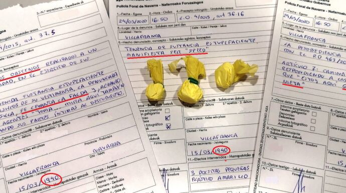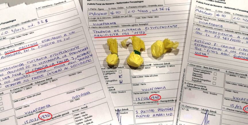 La Policía ha publicado una fotografía de las tres denuncias junto a los tres envoltorios de la droga intervenida. Se trata de dos infracciones graves por movilidad ilegal, y tenencia de drogas, por importe de más de 600 euros cada una y otra leve por actos obscenos de entre 100 y 600 euros. "Esta profesión es admirable, siempre hay algo más...", ha publicado la Policía Foral en tono irónico en redes sociales.