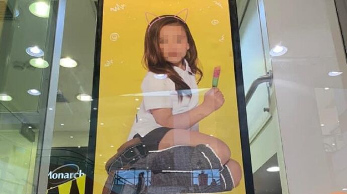 Otro de los anuncios señalados muestra a una niña abriéndose la camisa, similar a las usadas en uniformes, para mostrar su ropa interior, así como parte de su torso.