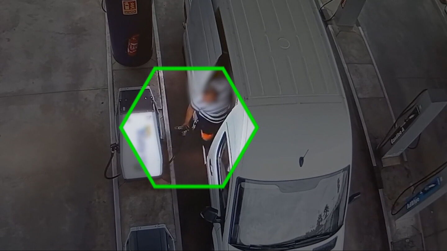 Algo similar hace el protagonista del segundo ejemplo. Abre la puerta lateral de la furgoneta, mete la manguera del surtidor dentro del vehículo y la cierra como si nada. Oculta cómo llena un recipiente. También lo hacen de forma más descarada, sin esconderse, llenando una cubeta totalmente visible que tiene en la parte trasera del camión.