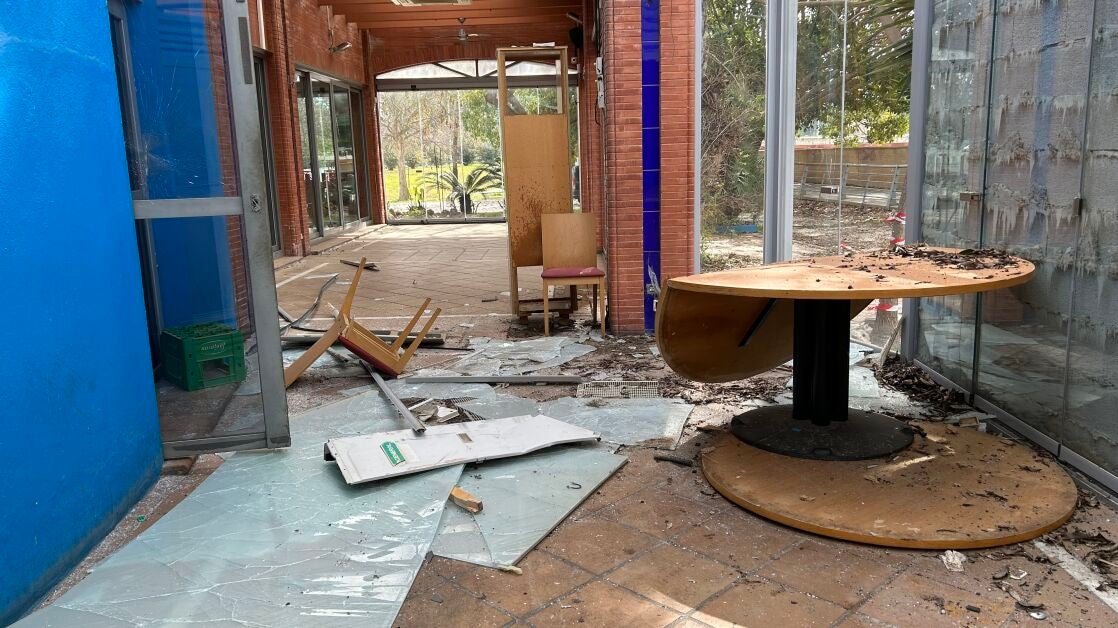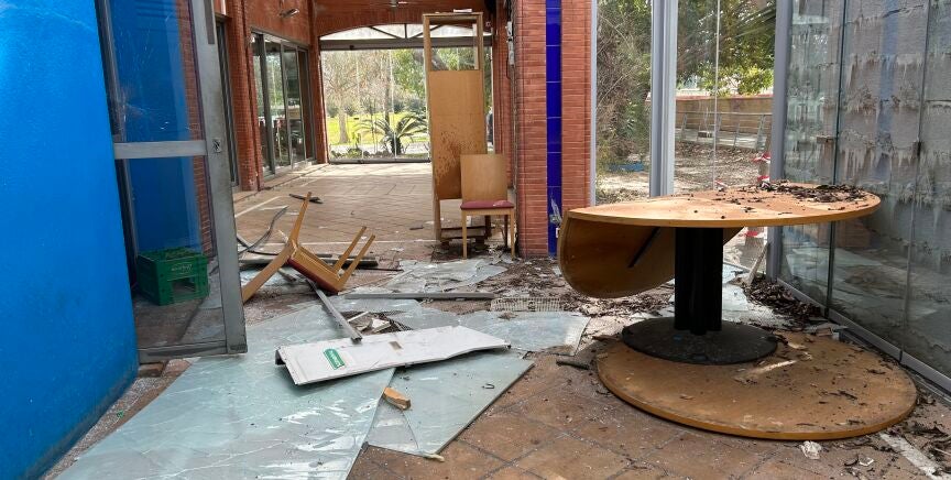 Desde el exterior de lo que fue Cantora Copas se aprecian precintos rotos y las puertas forzadas, cristales hechos añicos, mesas y sillas tiradas por el suelo, pintadas y mucha suciedad.