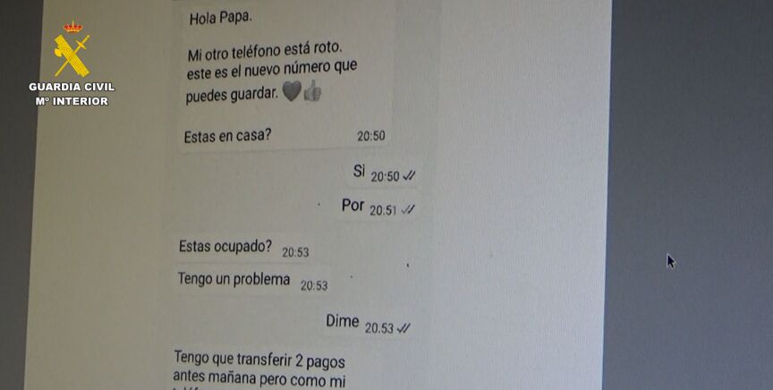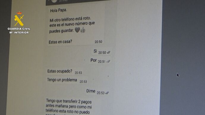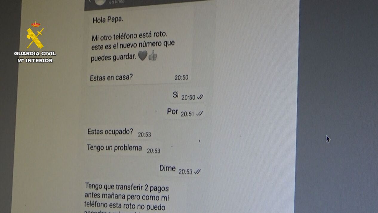 La Guardia Civil investiga a 32 personas por pertenencia a grupo criminal. El mensaje que recibían las víctimas era: "Hola mamá. Mi móvil está roto. Tengo un número temporal. No puedo llamarte. Puedes enviarme un SMS a través de WhatsApp al número...".