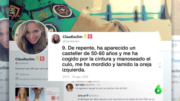 La periodista denunció ayer que, cuando estaba cubriendo la diada castellera de Sant Fèlix en Vilafranca del Penedès, fue víctima de acoso sexual, ya que varias personas la manosearon para hacerse fotografías con ella sin su permiso y posteriormente acudió un casteller que la cogió por la cintura, le hizo tocamientos y la vejó.