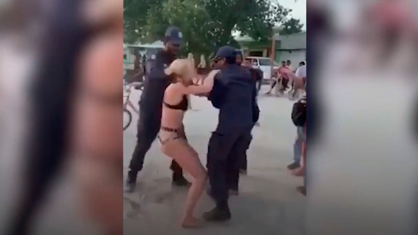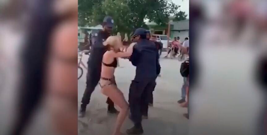 En el vídeo, difundido en las redes sociales, se puede ver cómo tres agentes de Policía tratan de poner las esposas a la joven, que intenta resistirse al arresto al tiempo que otro agente intenta cubrirla con una toalla. En el vídeo se oye a la mujer gritar: "¡Me están atacando sexualmente!".