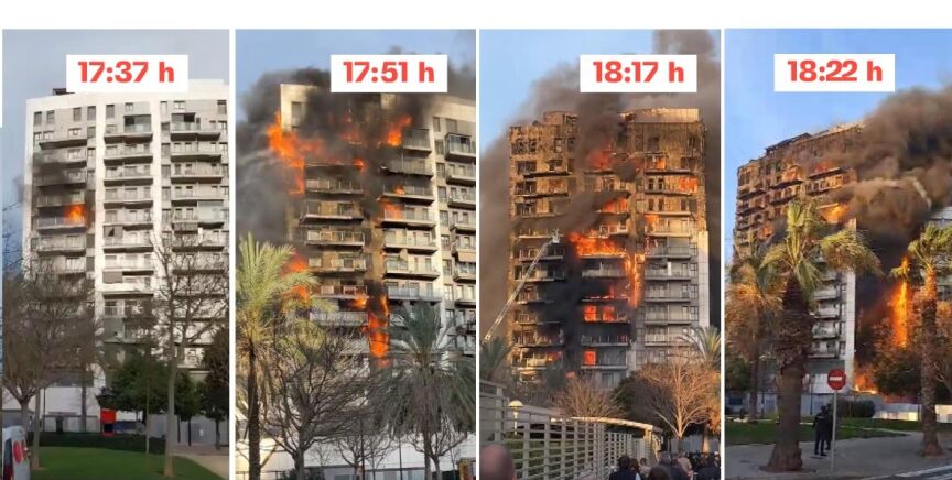 De la nada, al todo, en menos de 45 minutos. El devastador incendio declarado este jueves en un edificio de viviendas de 14 alturas en Valencia se propagó de una forma muy rápida, en principio por el poliuretano: en solo 44 minutos, el edificio fue devorado por las llamas. Una persona ha grabado cómo ha evolucionado el incendio en tan solo esos minutos.