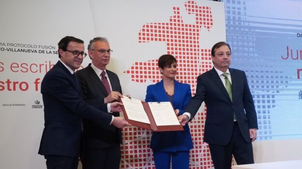 Las localidades pacenses de Don Benito y Villanueva de la Serena han firmado este viernes con cinco ministerios del Gobierno central, la Junta de Extremadura y la Diputación de Badajoz, el protocolo de la fusión. Hasta Don Benito ha acudido la ministra de Política Territorial y portavoz del Gobierno, Isabel Rodríguez; el presidente de la Junta de Extremadura, Guillermo Fernández Vara, y los alcaldes de Don Benito y Villanueva de la Serena, José Luis Quintana y Miguel Ángel Gallardo, para firmar el protocolo.