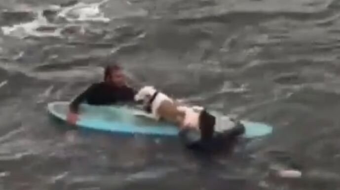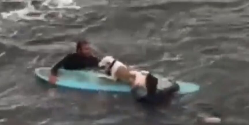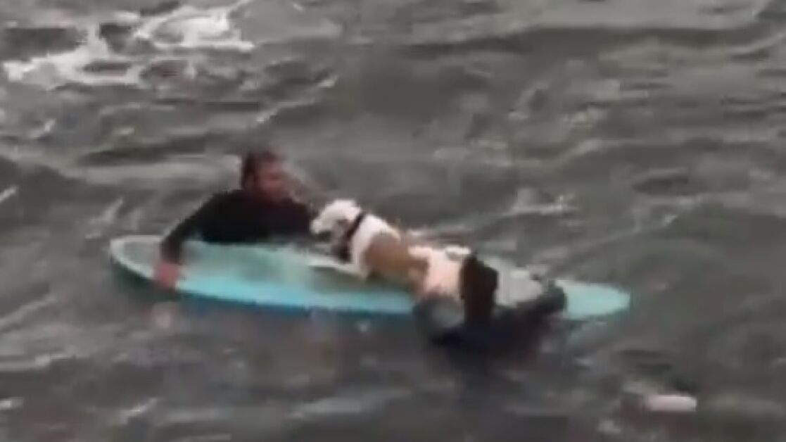 Finalmente, los surfistas logran coger al animal y lo sacan del agua montado en una de sus tablas de surf.