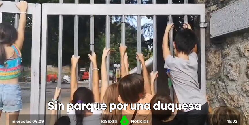 "Pedimos a la señora De Arteaga que reconsidere su decisión y que, en un acto de generosidad, pueda observar la necesidad de sus vecinas y vecinos, de los niñas y niños del pueblo de poder disfrutar de un parque como el del Duque del Infantado, así como el impacto negativo que su cierre puede tener sobre tantas personas en relación a su calidad de vida, la conciliación familiar o el tejido social", señalaba el manifiesto leído por dos madres del grupo de familias convocante de la reunión a unos metros del parque, cerrado desde el lunes y cuyos juegos infantiles han comenzado a ser desmantelados por operarios horas antes.