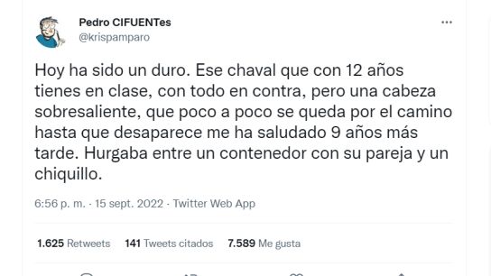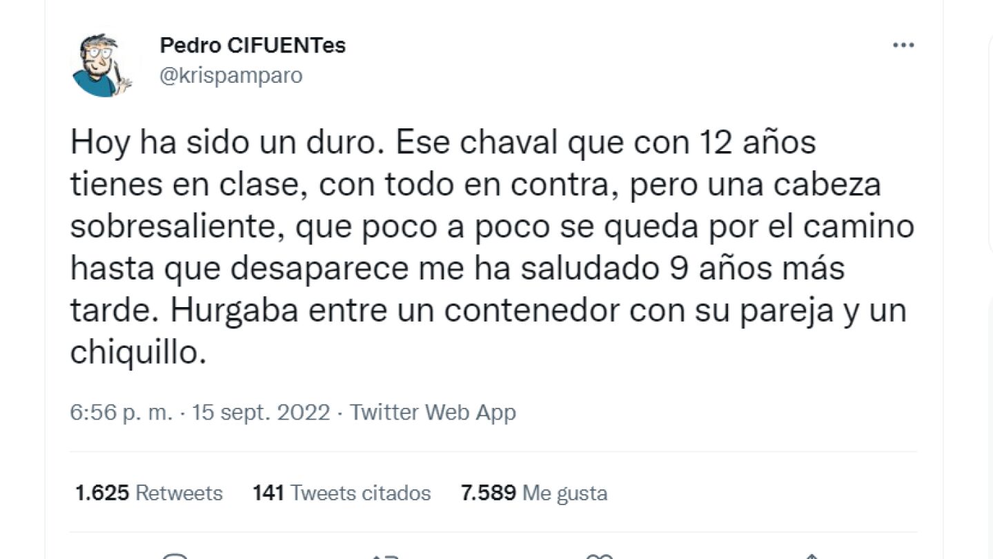 Así lo ha revelado él mismo en un hilo de Twitter donde ha asegurado que ese chico era una "cabeza sobresaliente con todo en contra". "Un alumno que en 1ESO luchó como un jabato a pesar de las cartas que le tocó en la vida", añade. Dada la situación, el profesor no ha dudado en denunciar el episodio de ese hombre que, cuando tenía 12 años, le dijo que estudiaría ciencias. "Me ha contado un poco su trayectoria y buffff", se lamenta Cifuentes.