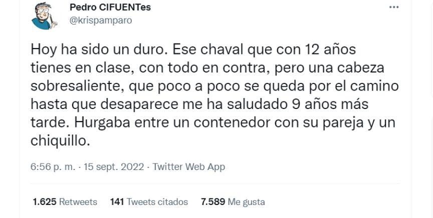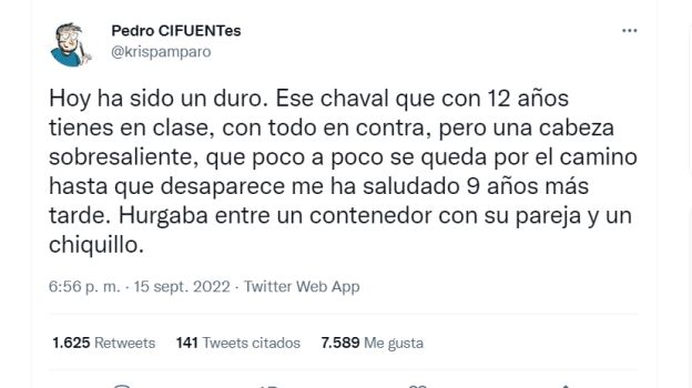 Un profesor de instituto ha compartido en Twitter el triste reencuentro que tuvo con un antiguo alumno, al cual se encontró hurgando en un contenedor junto a un niño y su mujer. "Un alumno que en 1ESO luchó como un jabato a pesar de las cartas que le tocó en la vida", añade.