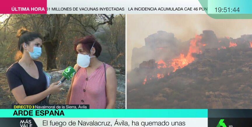 laSexta ha contado con el testimonio de una de las vecinas de Navalmoral de la Sierra, quien entre lágrimas ha explicado cómo se organizan para controlar el fuego. En su caso, ha presenciado con tristeza e impotencia cómo ardía una zona de pajares que eran de su padre.