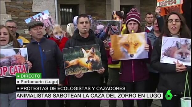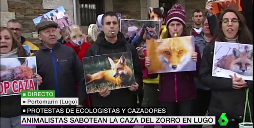 Protesta animalista contra el campeonato de caza del zorro, una tradición en tierras gallegas que cada año reúne a ecologistas y animalistas para intentar espantar a los animales. Los cazadores participantes, en torno al medio millar, aseguran que hay superpoblación.