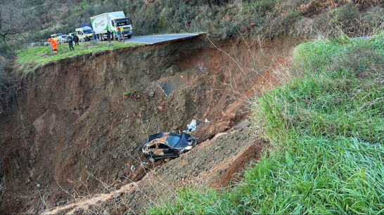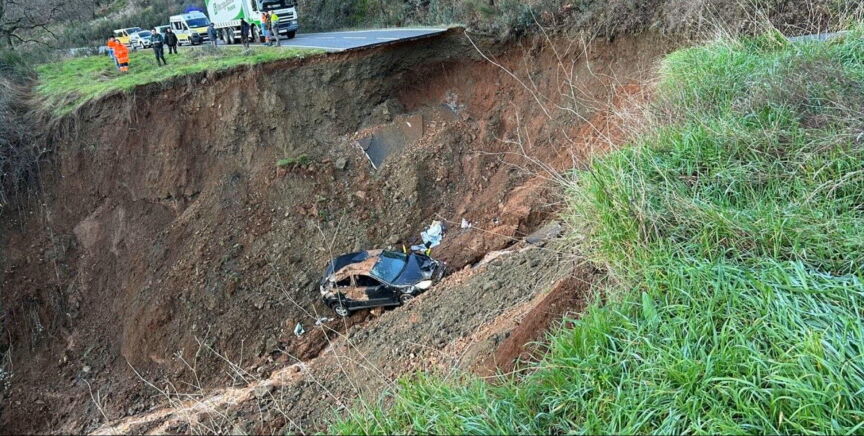 Los efectos del temporal: la tierra engulle a un coche que circulaba por una carretera en Cáceres