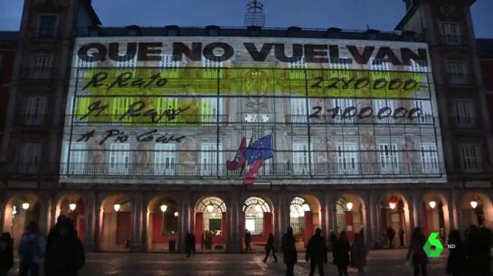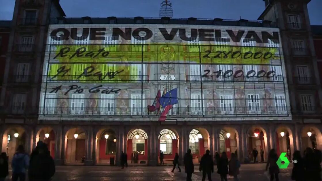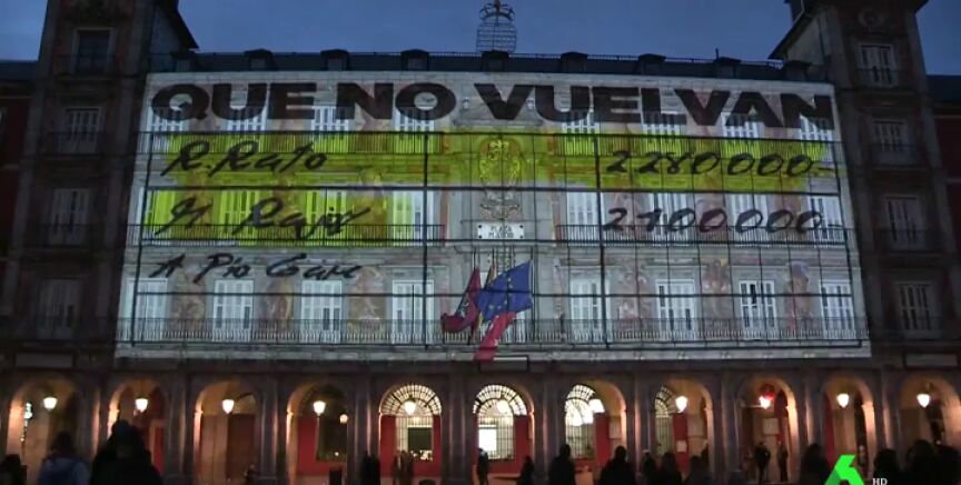 Sábado por la noche, Plaza Mayor de Madrid. Se proyectan los papeles de Bárcenas en una de las fachadas con un mensaje: "Que no vuelvan". Acción de Podemos que ya ha tenido respuesta del PP: lo recurrirán ante la junta electoral.