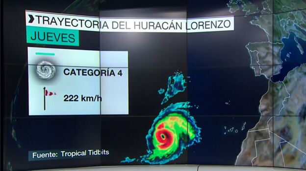 El huracán Lorenzo sigue creciendo y ya ha alcanzado la categoría 4 con unos vientos de 222 kilómetros por hora. La trayectoria que se le prevé es algo atípica, ya que está previsto que vaya a avanzar hacia el norte para acabar virando un poco hacia el nordeste.