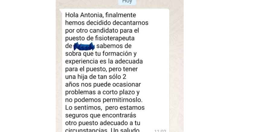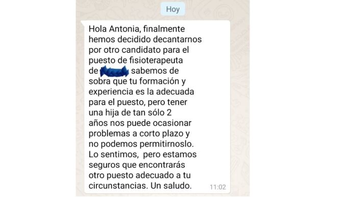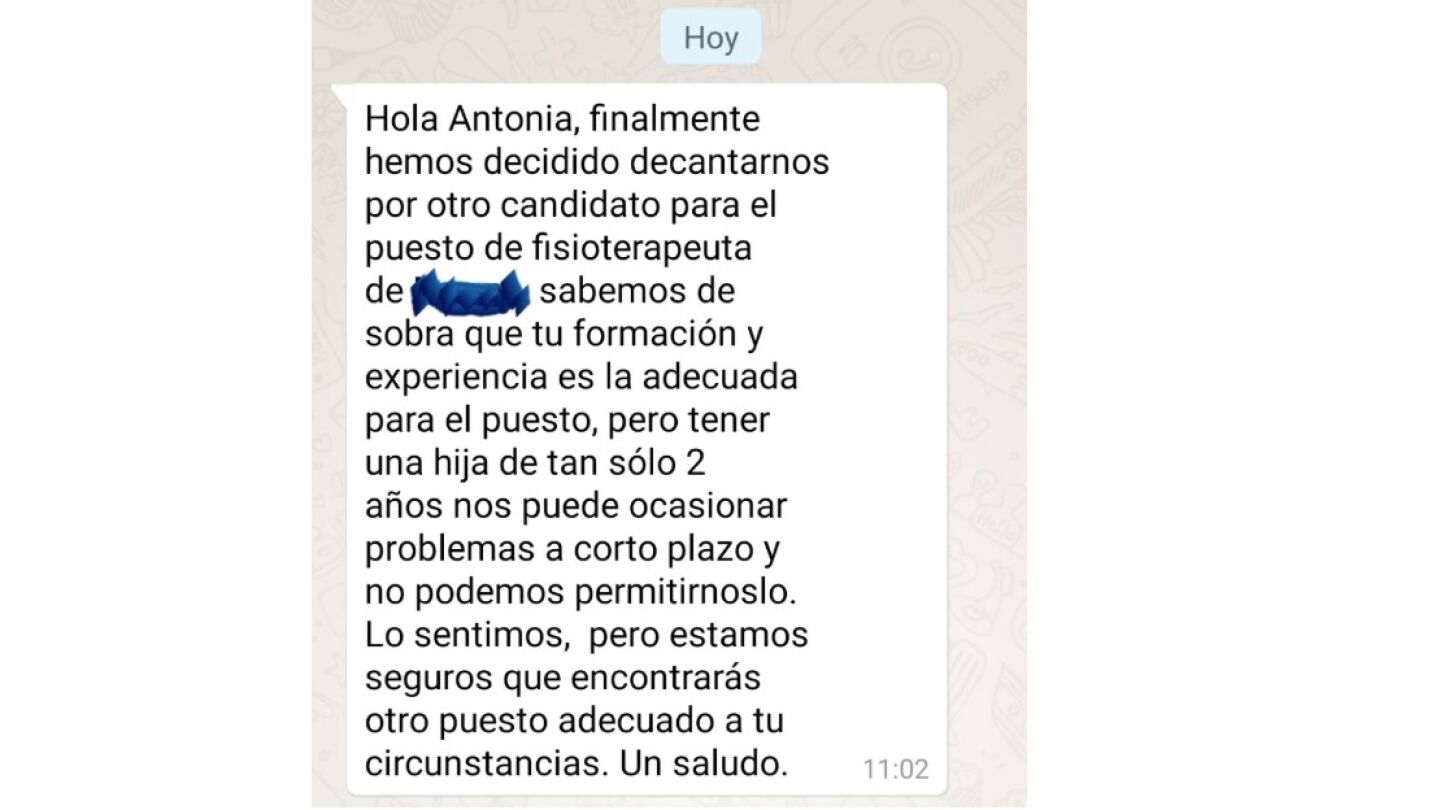 La razón es tan sencilla como injusta: es madre. "Me lo dijeron cuando me quedaban solo seis días para empezar y ni siquiera se dignaron a llamarme. Ya había superado el proceso de selección", afirma Antonia, a quien en el mensaje le decían que se decantaban por otro candidato porque "tener una hija de tan solo dos años puede ocasionar problemas a corto plazo".