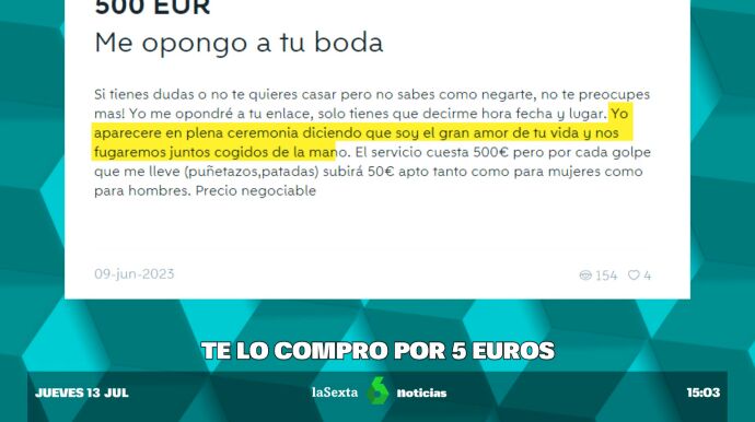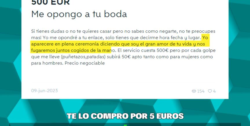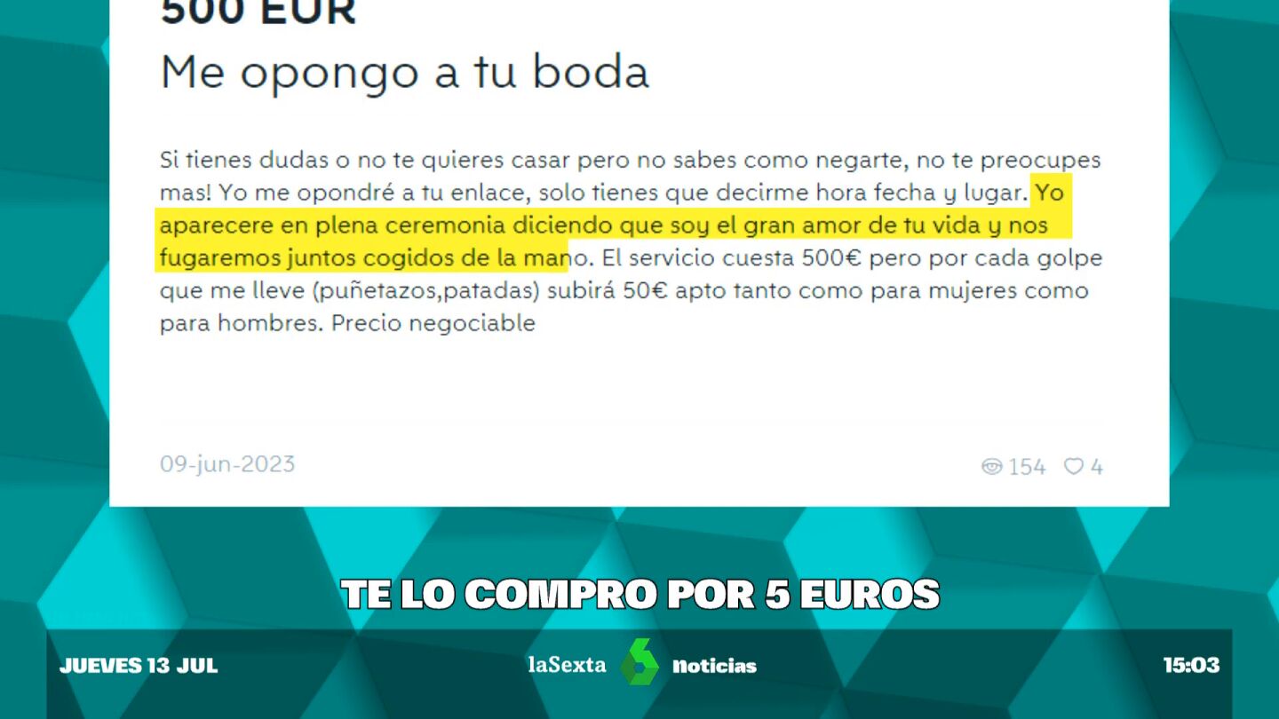 Todo está en Wallapop, esta famosa aplicación que lleva 10 años comprando y vendiendo. ¿Se casa y no sabe cómo evitarlo? Póngase este vídeo de laSexta Noticias y métase en Wallapop. Una sencilla búsqueda y encontrará que por 500 euros (negociables) hay quien se ofrece para oponerse a su boda. "Yo apareceré en plena ceremonia diciendo que soy el gran amor de tu vida y nos fugaremos juntos cogidos de la mano. El servicio cuesta 500 €, pero por cada golpe que me lleve (puñetazos, patadas...) subirá 50 €": así se ofrece un espontáneo en la aplicación.