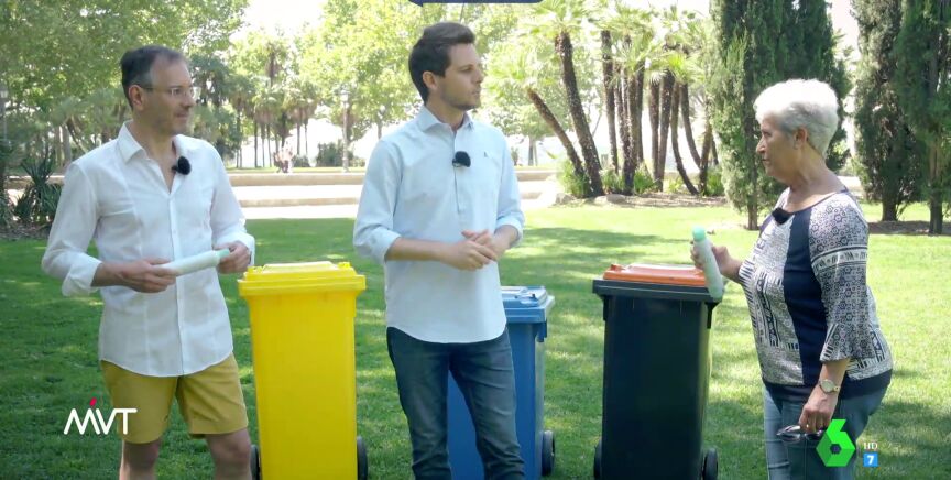 Los elegidos son Miguel, que afirma que está con el reciclado "a tope", y María Luisa, que asegura que procura reciclar "todo y más". Para ganar el juego tienen que acertar a qué contendor van los envases que el reportero les entrega. El primero, el bote de un aerosol. Ninguno de los dos concursantes dudan y lo depositan en el contendor amarillos, y es que sus metales se usan para crear nuevos envases.